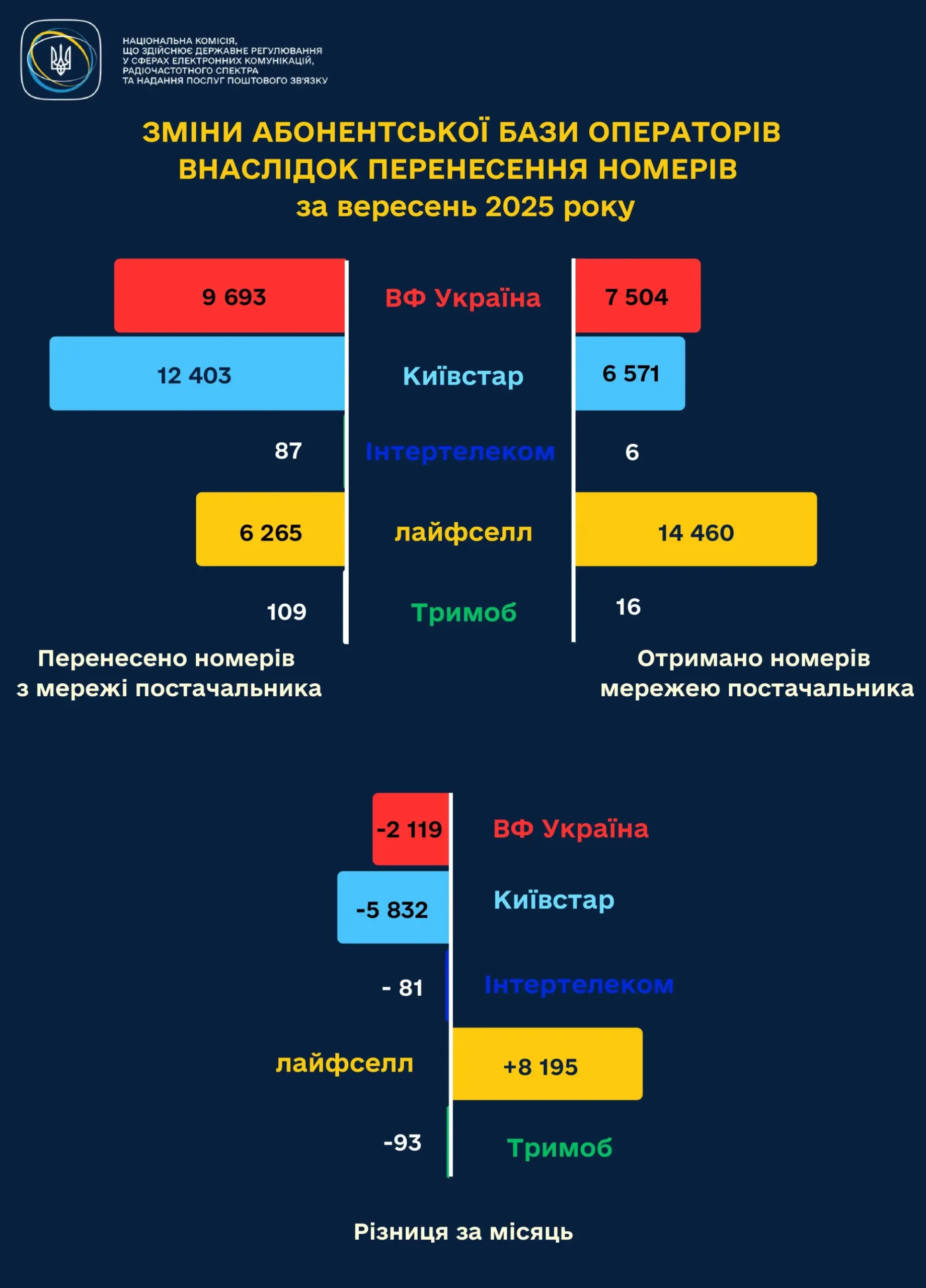У вересні 2025 року користувачі перенесли 28 557 мобільних номерів між операторами. Найбільше абонентів цього місяця залучив lifecell, тоді як Київстар мав найбільші втрати. Про повідомляє Mediasat з посиланням на офіційний звіт Національної комісії, що здійснює державне регулювання у сферах електронних комунікацій, радіочастотного спектра та надання послуг поштового зв’язку (НКЕК) інформує портал Prompolitinform.